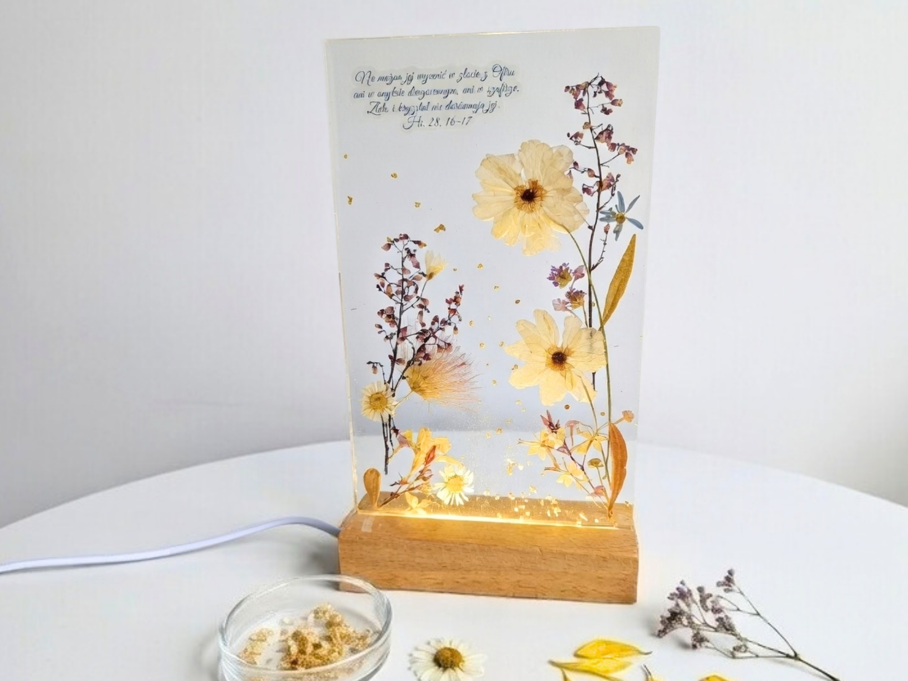 Materiały: żywica epoksydowa, żywe kwiaty, wypełnienia dekoracyjne, podstawka drewniana, оświetlenie LED